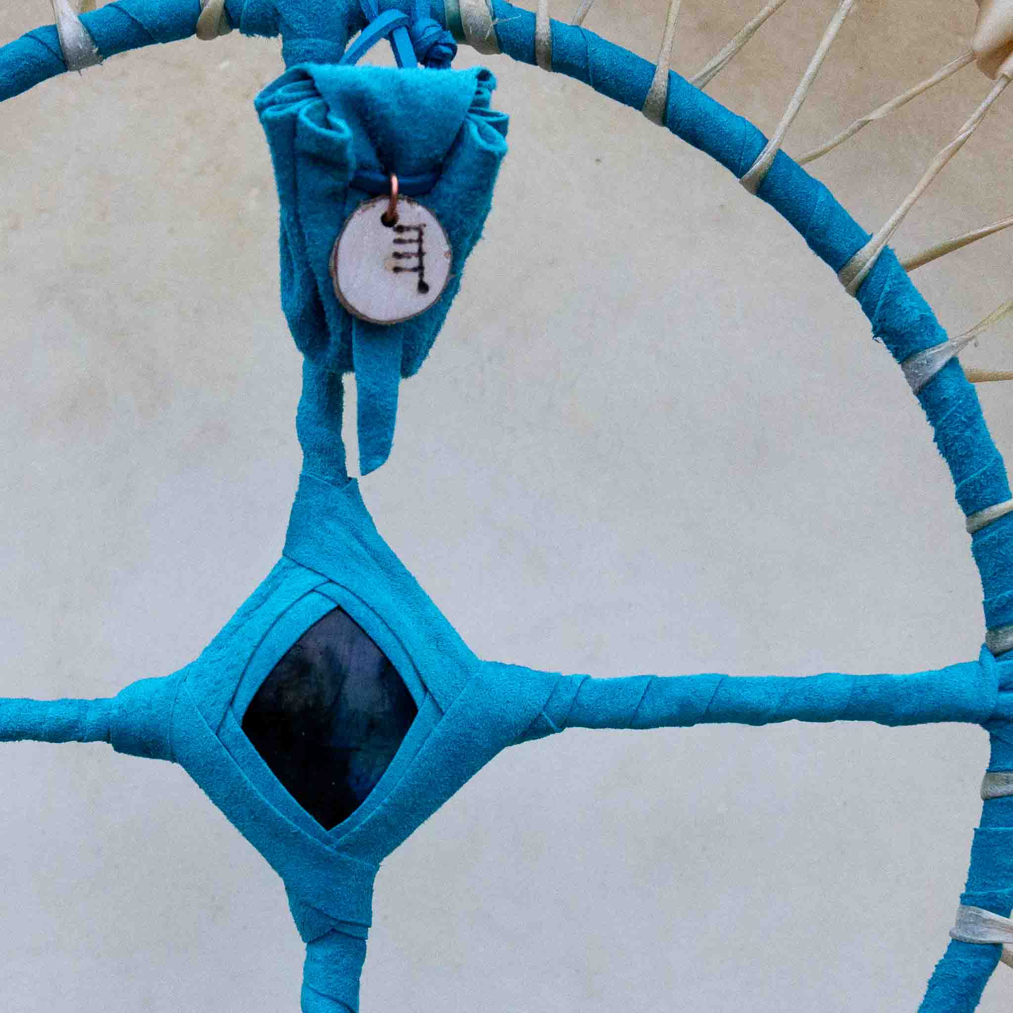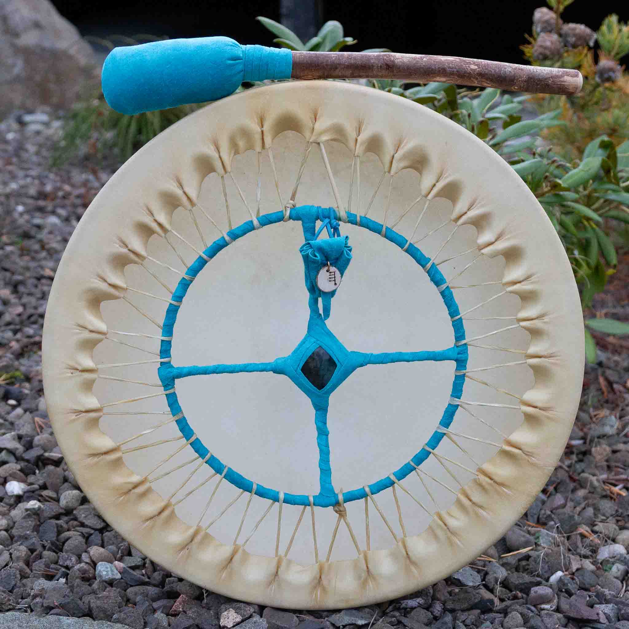 Reindeer Hide laced on a beeswaxed 16″ Ash frame and a turquoise leather bound ring.